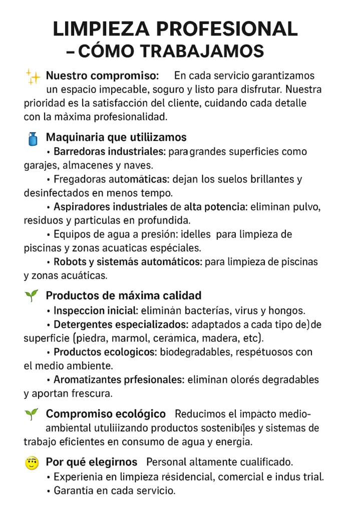 Trabajamos con maquinaria profesional (aspiradoras industriales, fregadoras y equipos de vapor) y productos certificados, además de ofrecer opciones eco. Contratos flexibles: limpieza diaria, servicio periódico (semanal/quincenal), limpiezas puntuales antes de aperturas o eventos y limpiezas nocturnas para no interrumpir tu actividad.