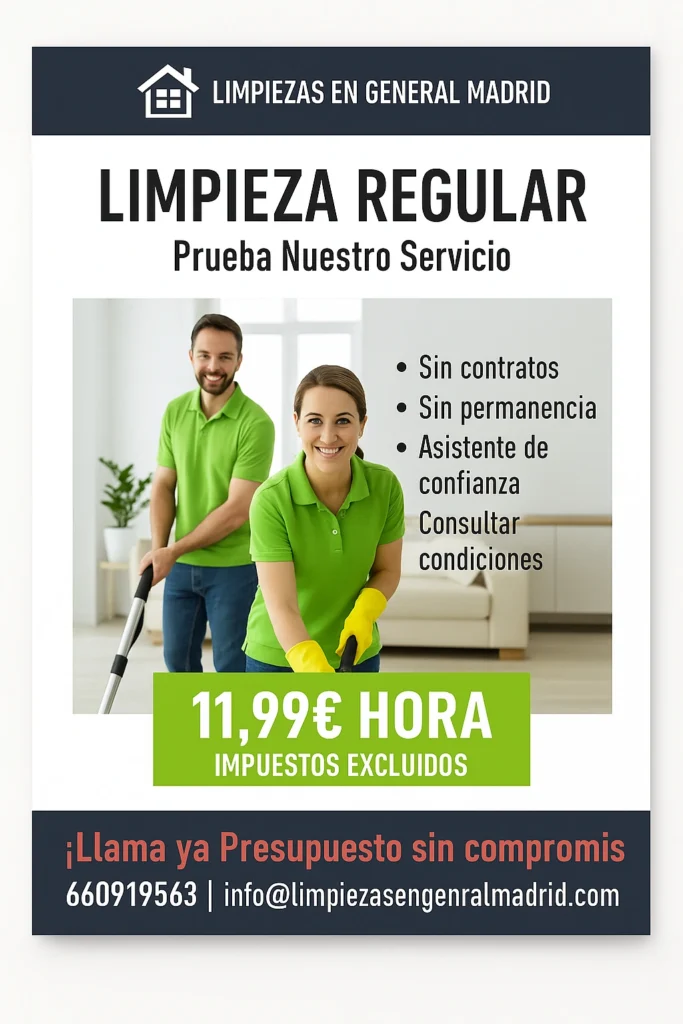 En Limpiezas General Madrid entendemos que tu tiempo es valioso y que tu hogar u oficina merece estar siempre en las mejores condiciones. Por eso hemos diseñado nuestro servicio de limpieza regular semanal, pensado para brindarte comodidad, confianza y resultados impecables.